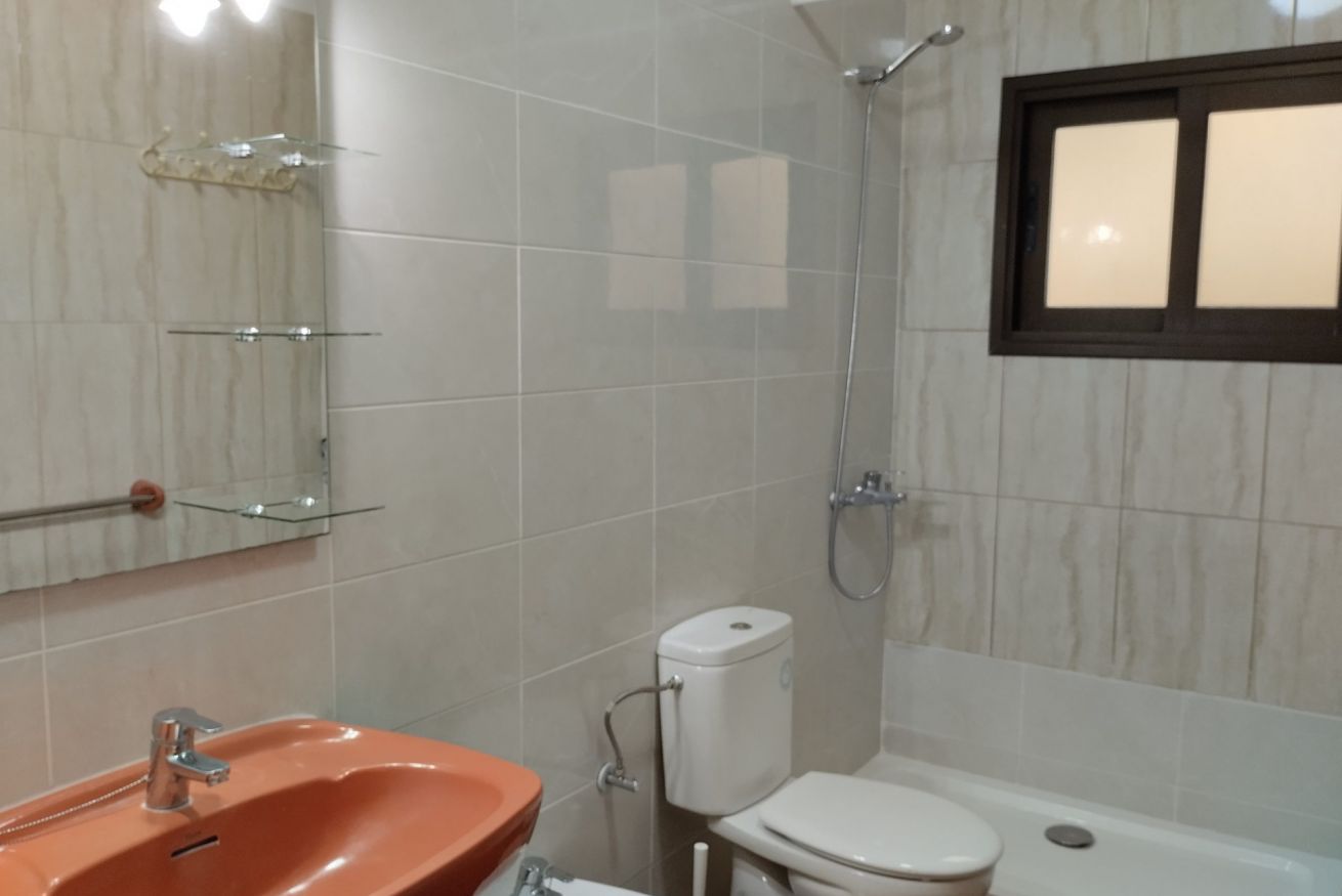 Dos baños amplios con platos de ducha, cocina equipada y espacioso salón.