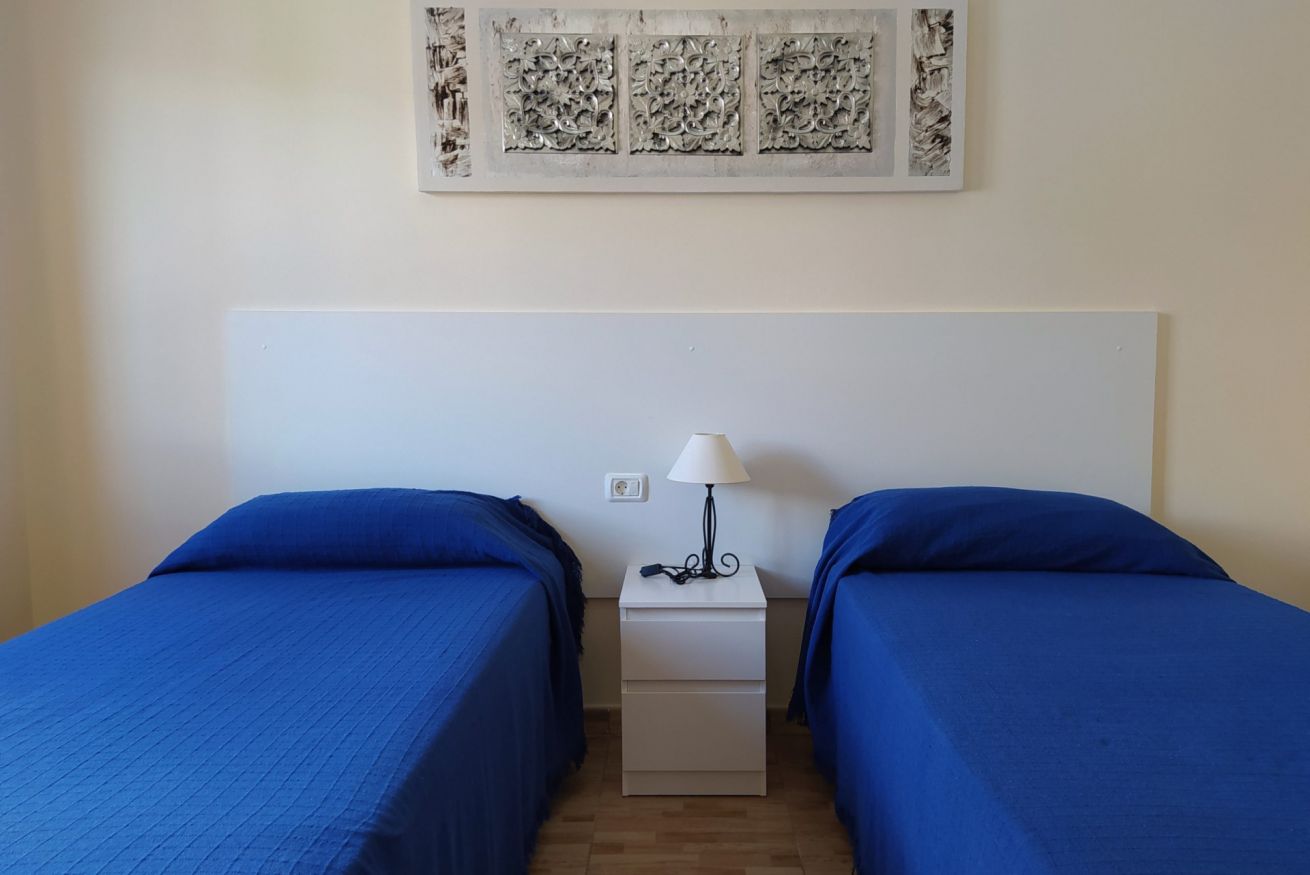 Apartamento con tres dormitorios que cuenta con camas de matrimonio e individuales.